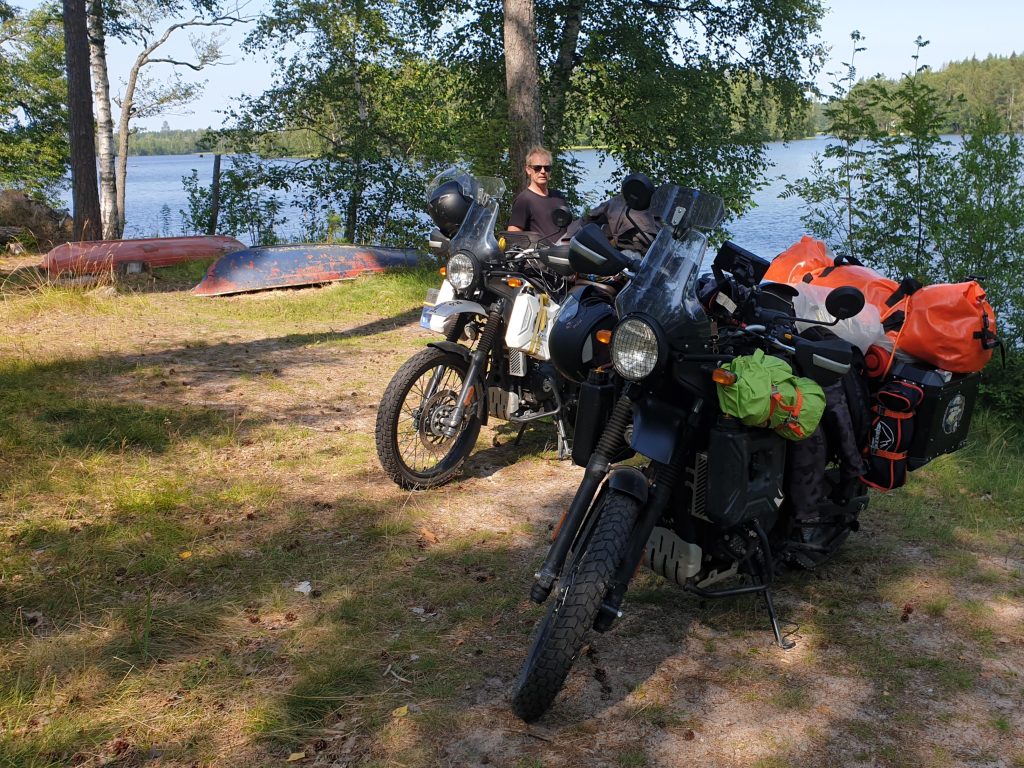 As the aim for the trip was testing the motorbikes for the upcoming BIG adventure we needed to feel how it was to drive some longer distances so we mainly passed by Finland without any stops. Well, we found a nice curvy road along a pretty nice lake, perfect for a short break.